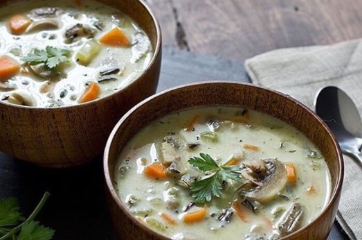 Uzsilda pannu, uzlej eļļu, liek virsū dārzeņus un sēnes. Sautē uz vidējas uguns aptuveni 3-4 minūtes. Kad dārzeņi izcepušies, liek tos katlā un vāra 7-10 minūtes. Sasmalcina zaļumus.